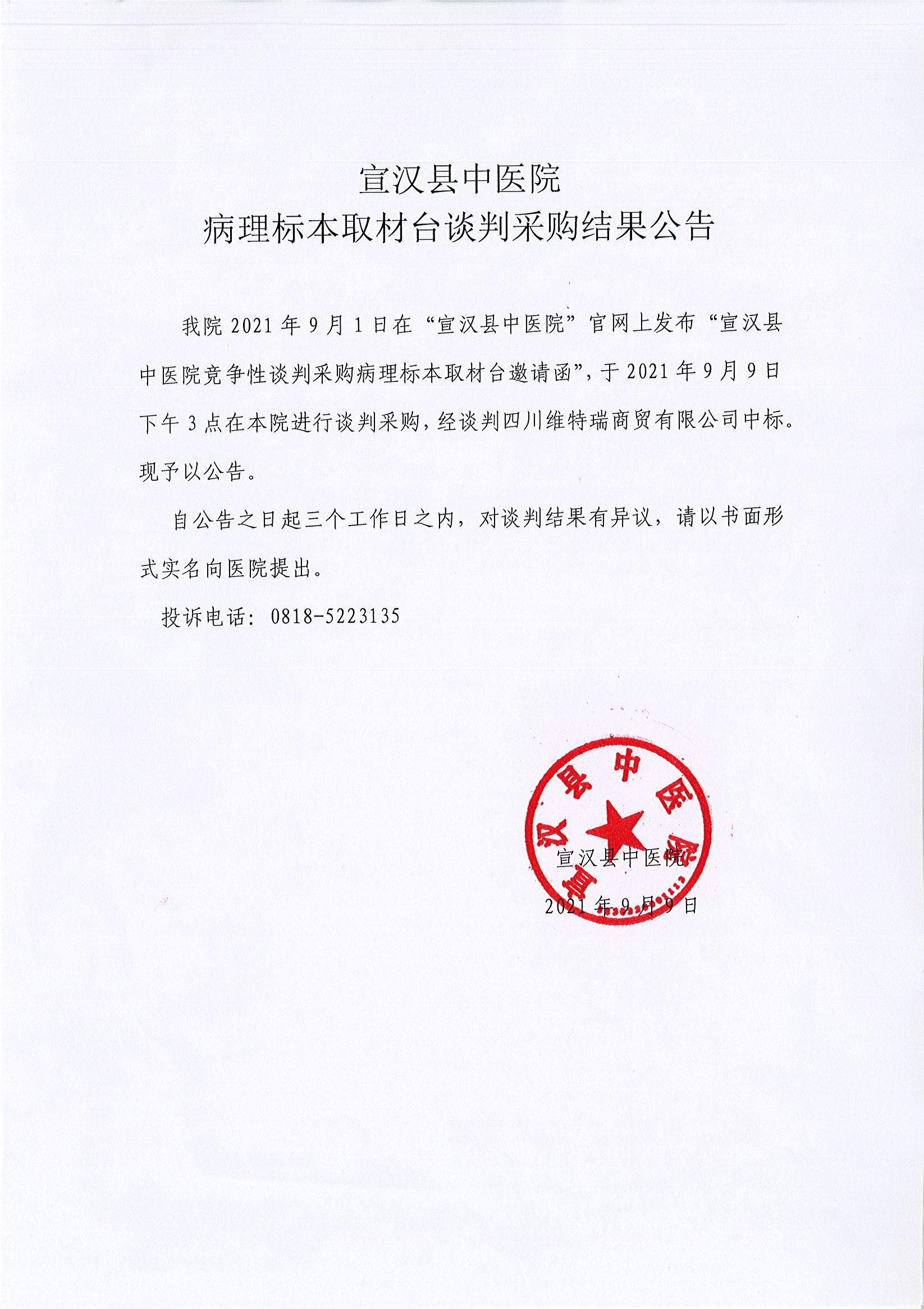 病理标本取材台谈判采购结果公告