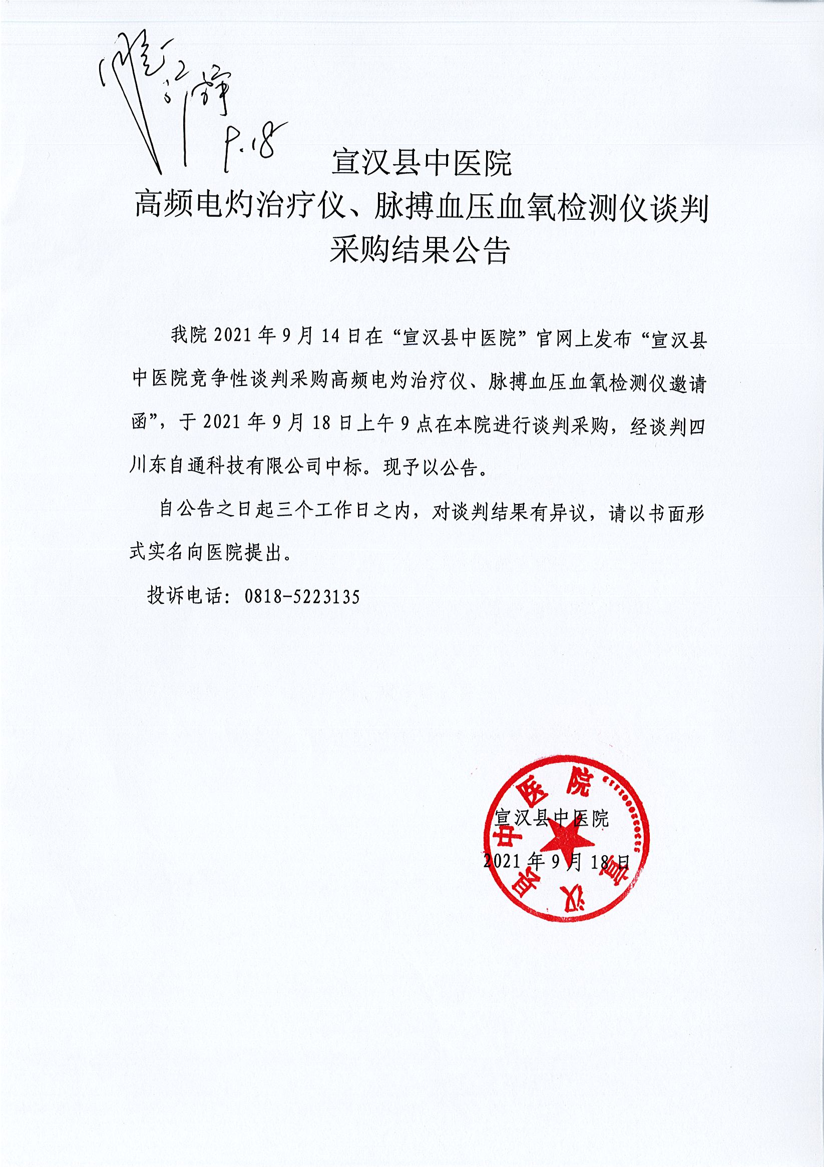 高频电灼治疗仪、脉搏血压血氧检测仪谈判采购结果公告