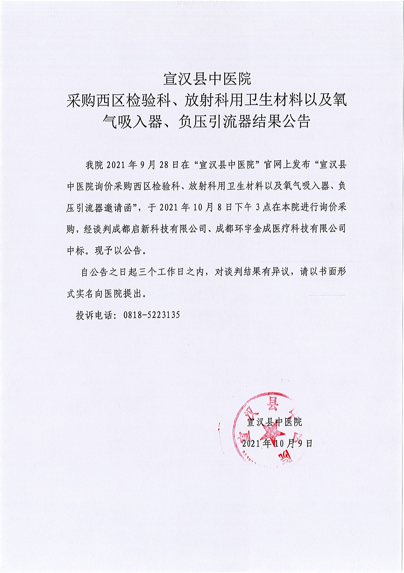 采购西区检验科、放射科用卫生材料以及氧气吸入器、负压引流器结果公告