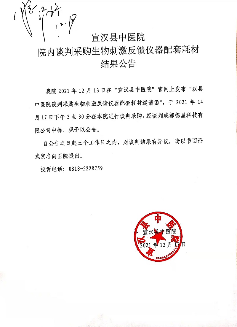院内谈判采购生物刺激反馈仪器配套耗材结果公告
