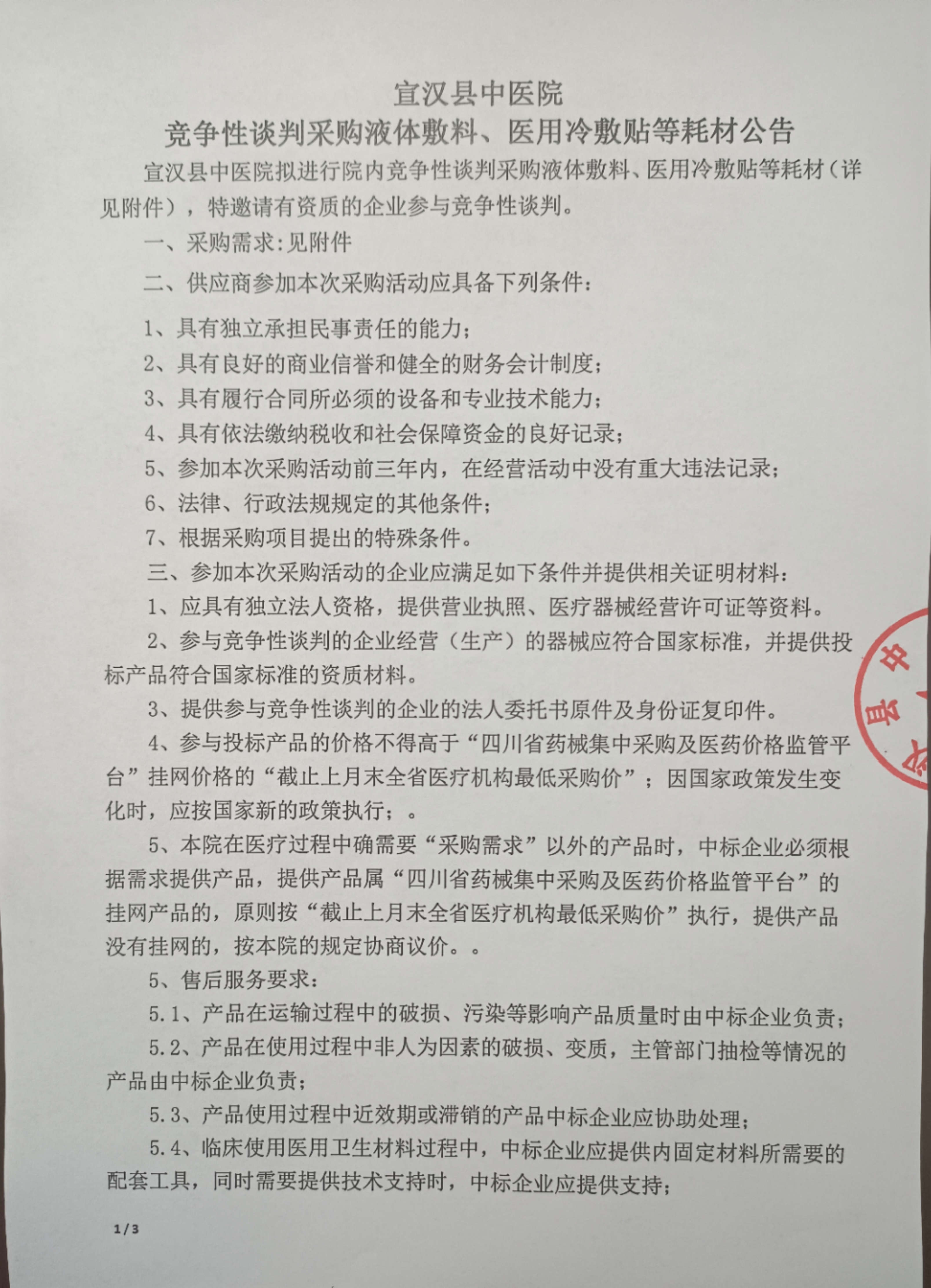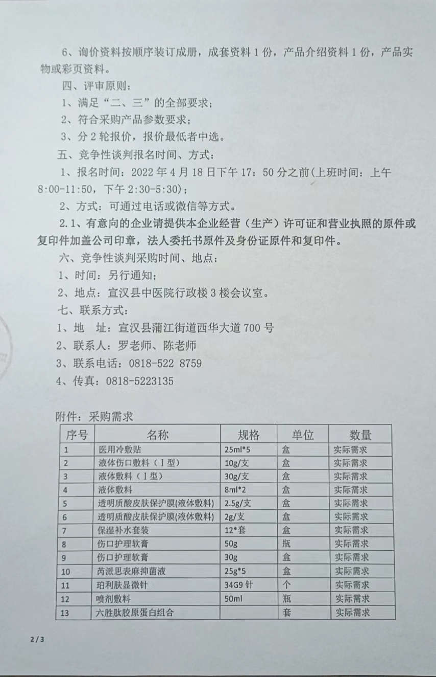 竞争性谈判采购液体敷料、医用冷敷贴等耗材公告