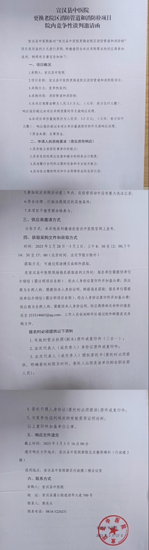 更换老院区消防管道和消防栓项目院内竞争性谈判邀请函