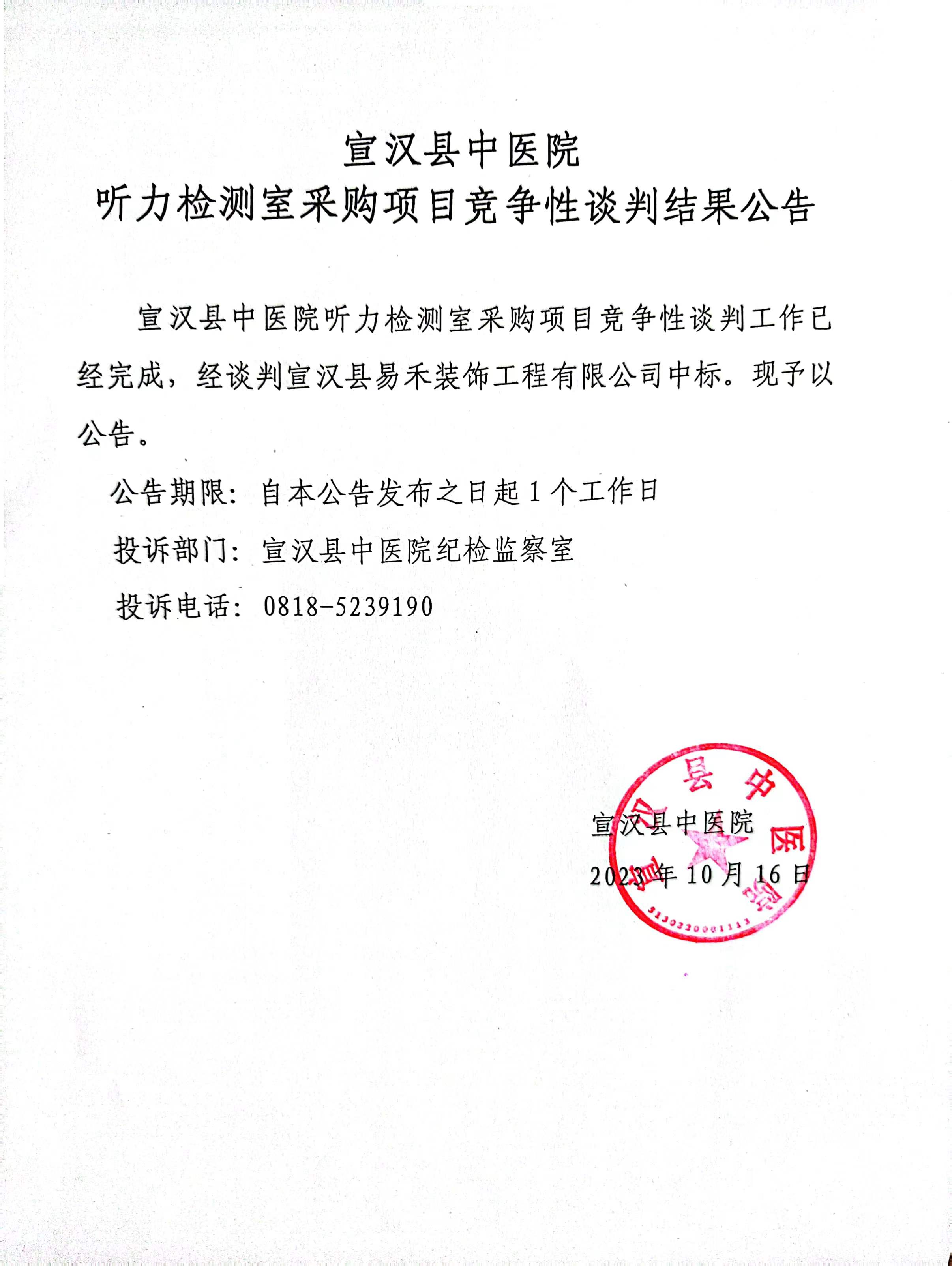 宣汉县中医院 听力检测室采购项目竞争性谈判结果公告