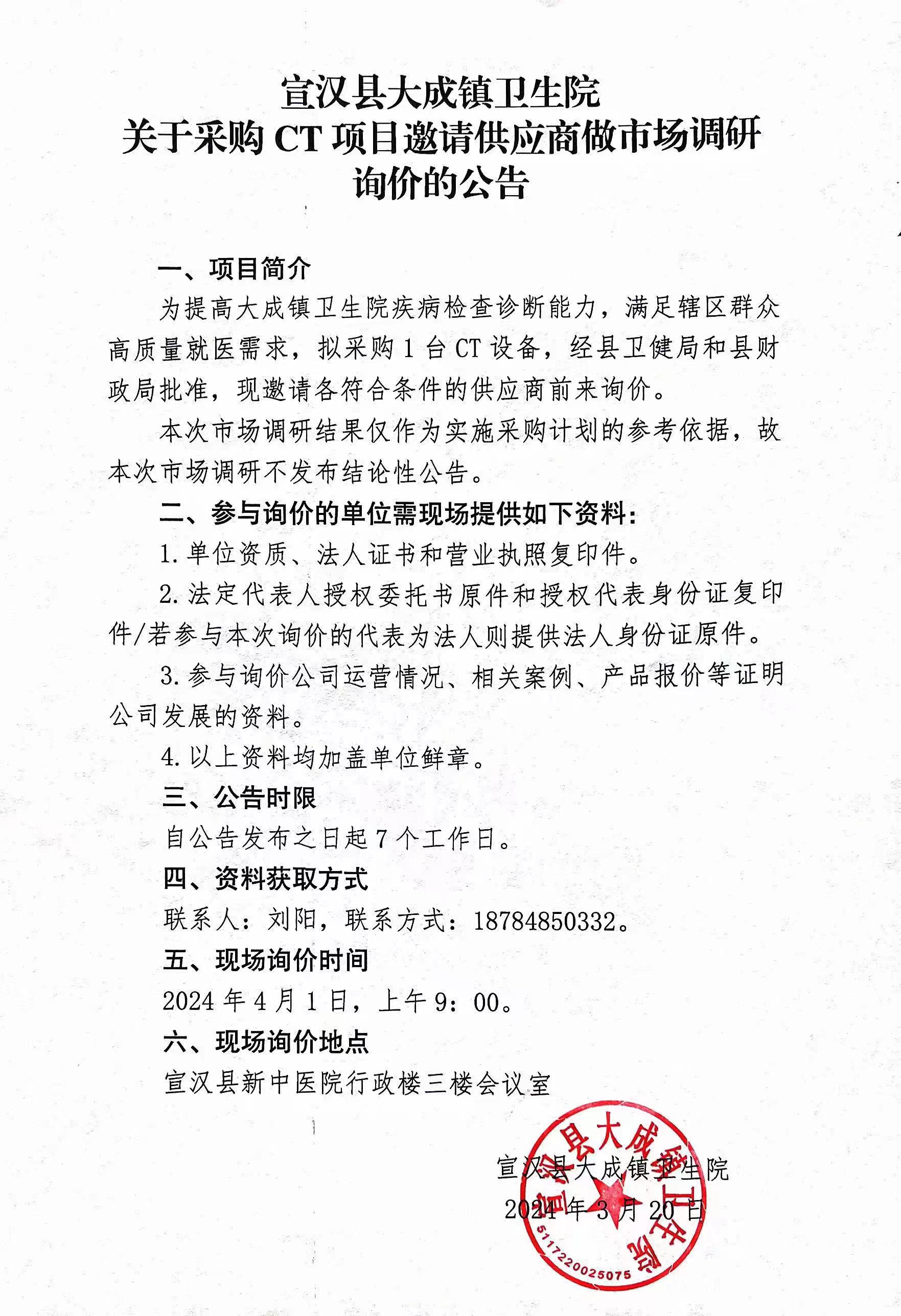 宣汉县大成镇卫生院关于采购CT项目邀请供应商做市场调研询价的公告