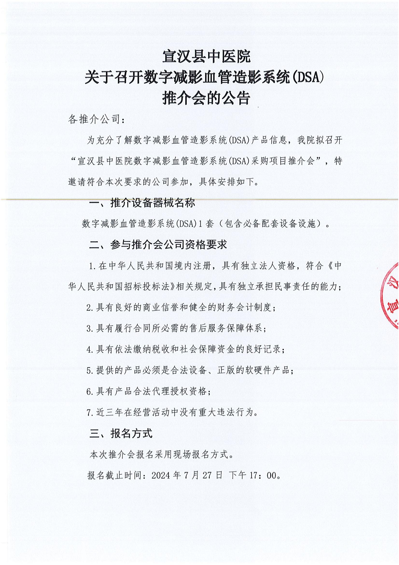 宣汉县中医院关于召开数字减影血管造影系统(DSA)推介会的公告