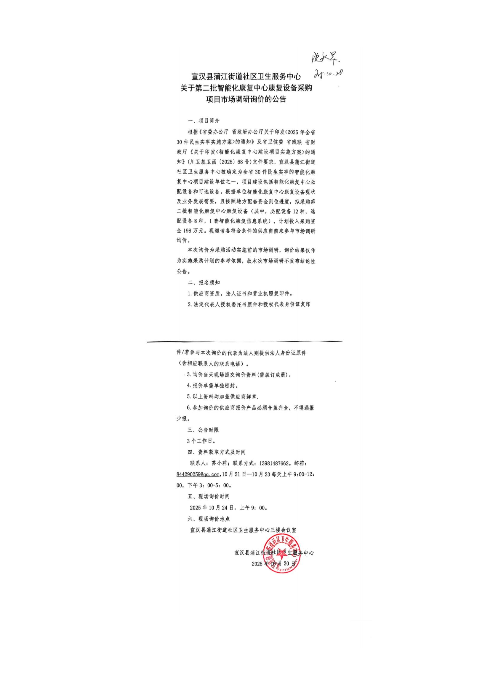 宣汉县蒲江街道社区卫生服务中心关于第二批智能化康复中心康复设备采购项目市场调研询价的公告