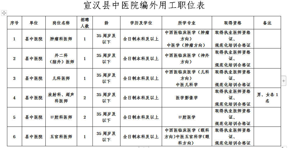 拟招聘8人,其中肿瘤科1人、外二科(脑外)1人、儿科1人、放射科1人、超声科1人、口腔科2人、五官科1人(职位表详见附件)。