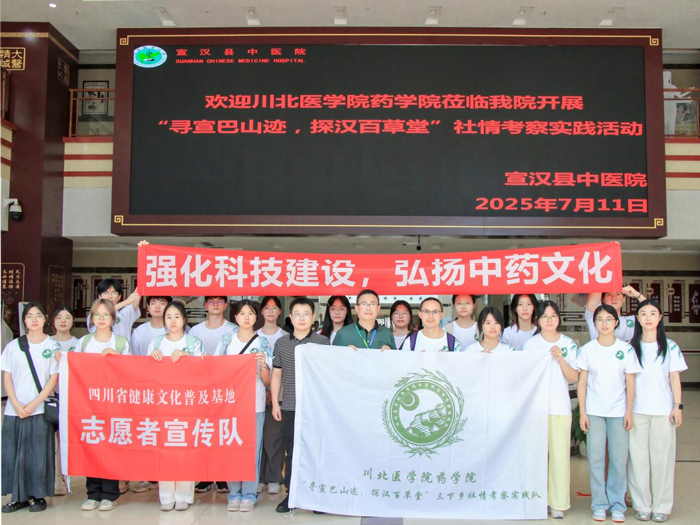 7 月 11 日上午,川北医学院药学院社情考察实践队 20名师生骨干,前往宣汉县中医院开展以“寻宣巴山迹,探汉百草堂”为主题的社会实践活动。宣汉县中医院副院长庞灵烈、医教科负责人刘功德陪同调研。